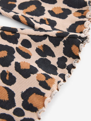Level-up her everyday looks with our leopard print rib flare leggings. Made from a cotton rich blend for added comfort and finely finished with lettuce trim edges, an elasticated waistband amd ribbed detailing. Ribbed cotton stretch fabric Elasticated waistband Pull-On style Wide-leg shape Lettuce trim edges Machine washable. 95% Cotton, 5% Elastane. Country of Origin: Bangladesh