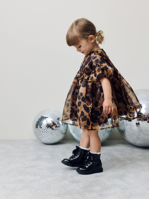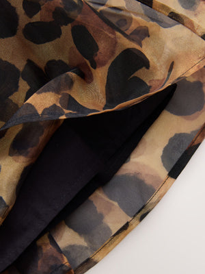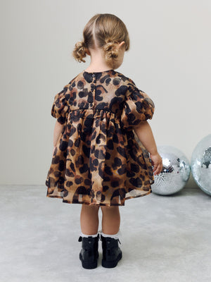 This stunning party dress has an all-over animal print and a lightweight fabric with a comfortable cotton lining, featuring frill detailing to the waist and short puff sleeves, finished with a button-down fastening. Light fabric Cotton lining Animal print Short puff sleeves Frill detailing Main 100% Recycled polyester. Lining 100% Cotton. Country of Origin: India