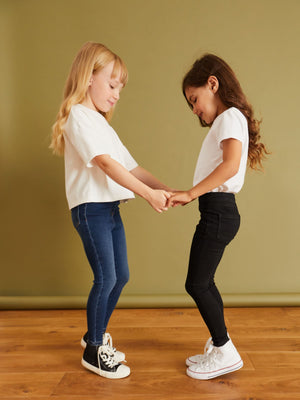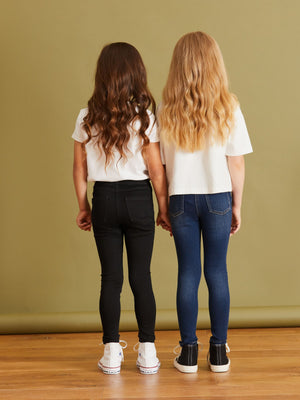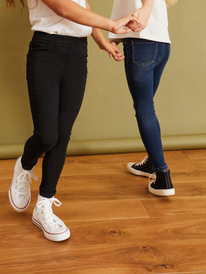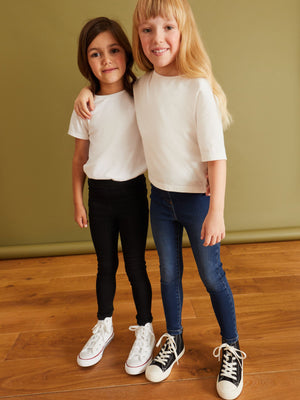 Our girls' jeggings come in a handy 2 pack, offering the look of jeans with the comfort of leggings. The super-soft denim finish and stretchy waistband ensure all-day ease. With a mock zip and pocket detail, they're effortlessly stylish and perfect for active playdates. Super-soft fabric