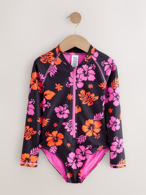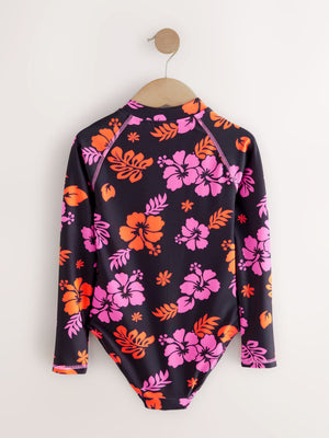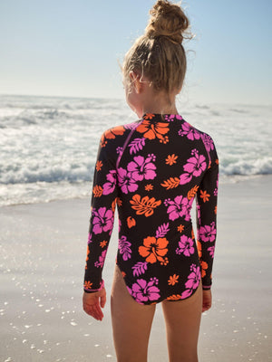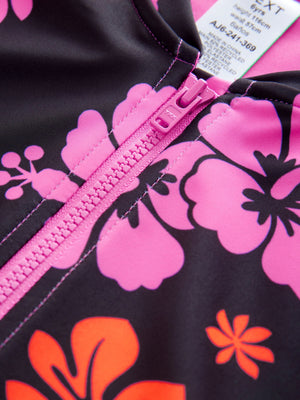 Black/Pink Tropical Long Sleeved Sunsafe Swimsuit (3-16yrs)