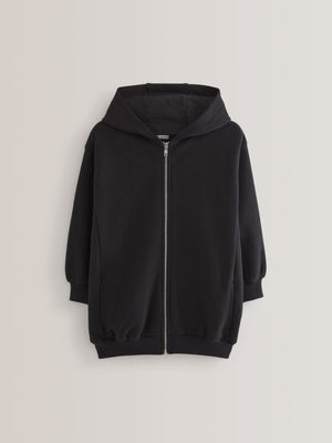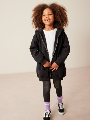 Crafted from soft cotton jersey with a classic black hue, this longline hoodie is the perfect blend of style and comfort for your little one. Its zip through design and cosy brushback lining make it an essential piece for layering on those cooler days or for making a stylish laidback look. Cotton rich Zip fastening Longline length Cuffed sleeves Brushback lining Machine washable. 93% Cotton, 7% Polyester. Country of Origin: Pakistan