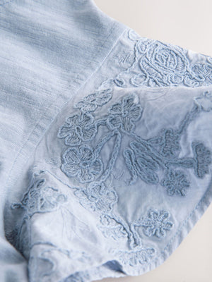 Made from pure cotton, this blue regular fit t-shirt is elevated with cornelli frill sleeves that have embroidered detailing. Complete with a slub jersey texture, pair with jean and sandals for a summer ready look. 100% cotton Regular fit Frill sleeves Embroidered detailing Machine washable. 100% Cotton. Country of Origin: India