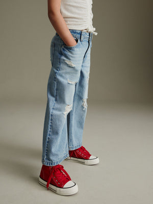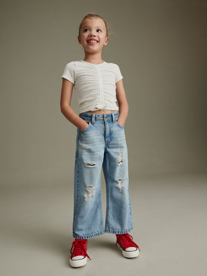 With an on-trend retro look, they'll love these comfortable wide-leg jeans. Crafted from pure cotton denim, these jeans feature an inner adjustable waist for the perfect fit, with distressed detailing, side and rear pockets and a button and fly fastening. Wide leg Regular adjustable waist 100% cotton denim Distressed detailing Side and rear pockets Button and fly fastening 100% Cotton. Country of Origin: Bangladesh
