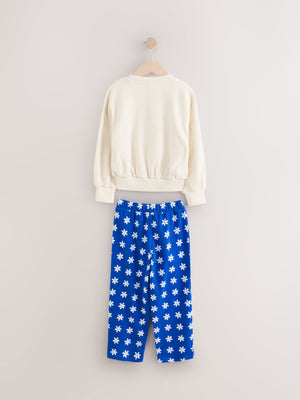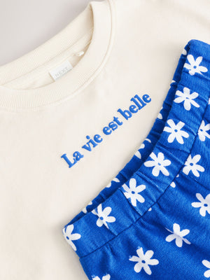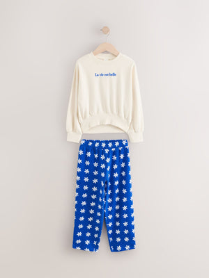 This comfortable and stylish 2-piece set features an ecru cotton-blend crewneck sweatshirt with blue puff slogan print and ribbed trims, alongside a pair of full-length blue floral-print cotton bottoms with an elasticated waistband. 2-piece set Cotton-blend crewneck sweatshirt Ribbed hems Full-length bottoms Elasticated waistband Machine washable. Sweater and Trouser 100% Cotton. Country of Origin: Bangladesh