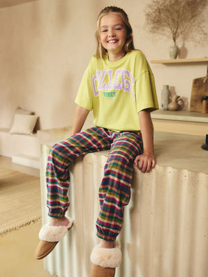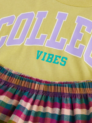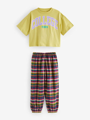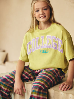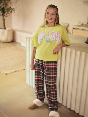 This stylish 2-piece pyjama set features a pure cotton construction across a college vibes graphic top with a green base, alongside a pair of check full-length bottoms with an elasticated waistband. 2-piece set 100% cotton Long sleeve top College design Full-length check bottoms Machine washable. Pyjama Top and Pyjama Bottom 100% Cotton. Country of Origin: Bangladesh Warning: Keep away from fire and flames.
