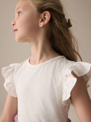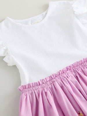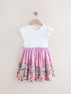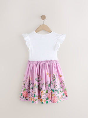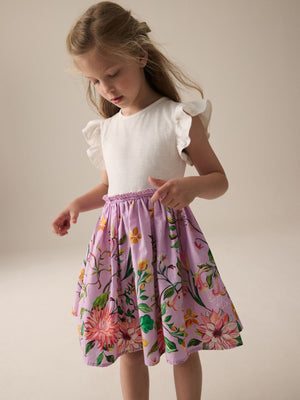 This lilac cotton dress adds a dose of flower power to her look. With a white jersey top and lilac floral printed skirt, this flowy and fun dress is perfect for her summer adventures. 100% cotton Floral print skirt White jersey top with frill sleeves Shirred waistband Machine washable. Main 100% Cotton. Skirt 100% Cotton. Country of Origin: Sri Lanka