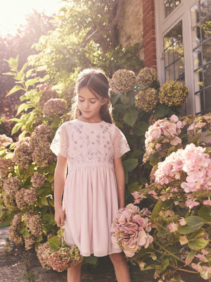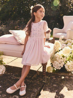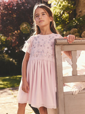 This pretty lilac purple dress is perfect for parties, or making a regular day feel special, featuring intricate sequin and bead embroidery applied to a soft mesh fabric, with a comfortable jersey lining and a twirlable skirting. A button and zip fastening makes dressing easy. Mesh fabric Sequin and bead detailing Zip and button fastening Soft lining Main 100% Polyester. Lining 100% Polyester. Mesh 100% Polyester. Country of Origin: India