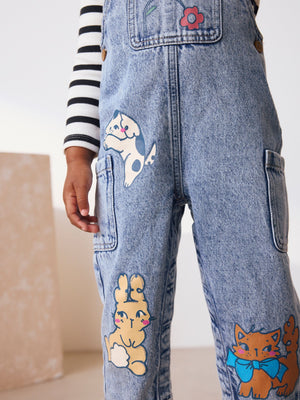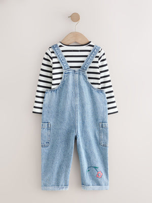 Mid Blue Denim Animal Print Dungarees and Stripe T-Shirt Set (3mths-7yrs)