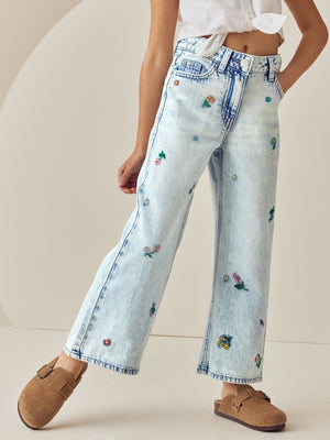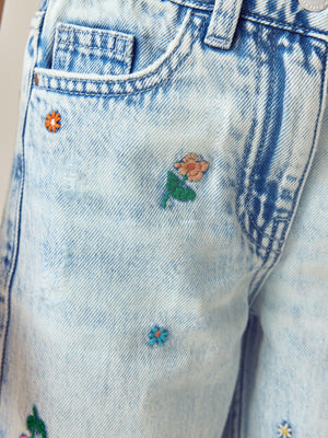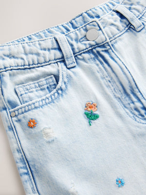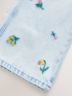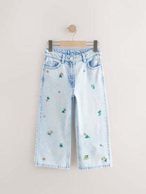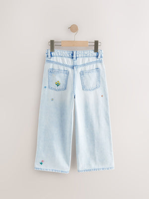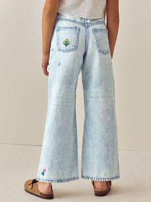Mid Blue Floral Embroidered Wide Leg 100% Cotton Jeans (3-16yrs)