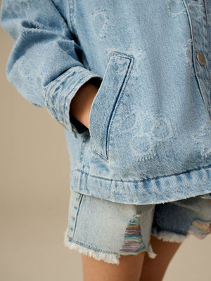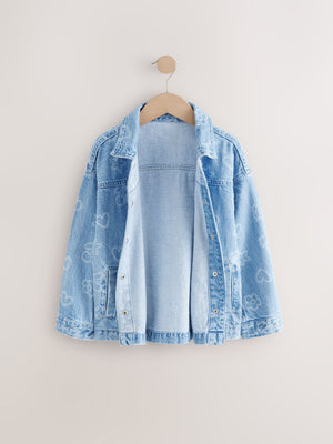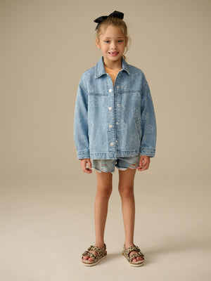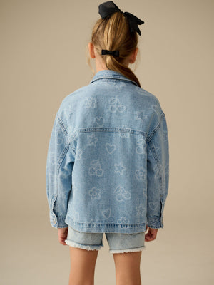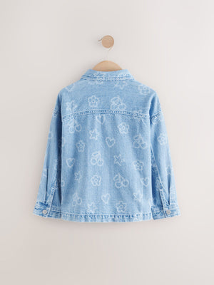 She'll love this denim shacket, made from pure cotton in a mid-blue wash, featuring an all-over flower, star and heart print, dual hand pockets and a classic collar, finished with a button-up fastening. 100% cotton Mid-blue denim finish Button-up fastening All-over print Classic collar Hand pockets Machine washable. 100% Cotton. Country of Origin: Bangladesh