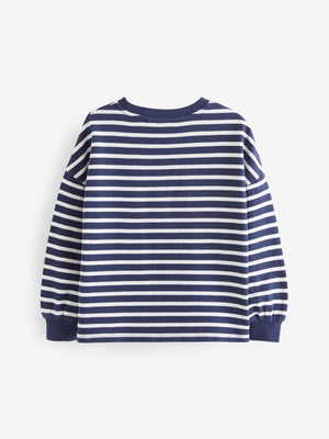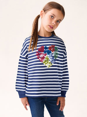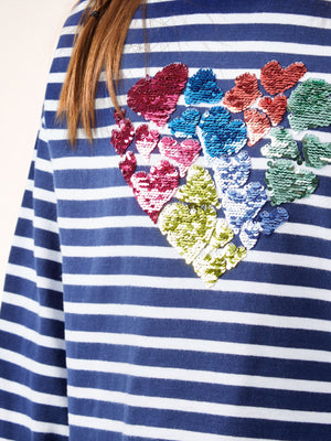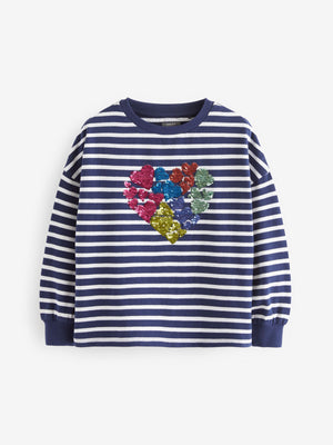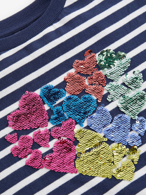Navy Stripe 100% Cotton Sequin Heart Long Sleeve T-Shirt (3-16yrs)