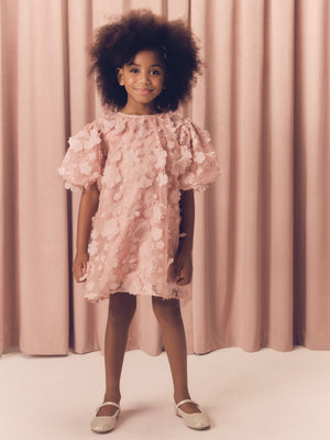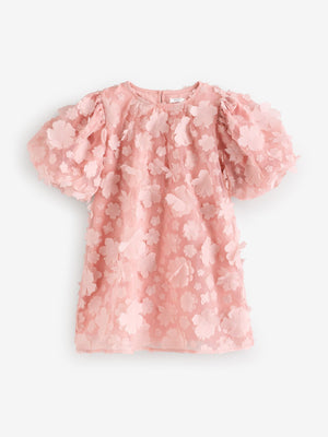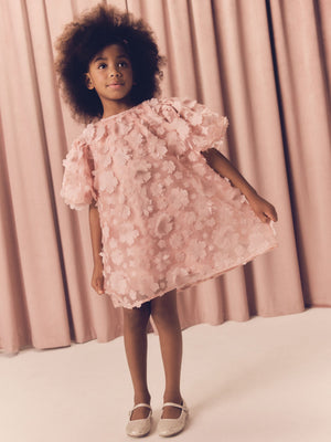 Ideal for special occasions, from family gatherings to weddings, this adorable pink dress has 3D floral detailing with short puff sleeves and a layered mesh fabric, finished with a crepe fabric lining and a button fastening to the back. Mesh fabric 3D floral detailing Short puff sleeves Button fastening Fully lined Main 82% Polyester, 18% Nylon. Lining 100% Polyester. Country of Origin: China