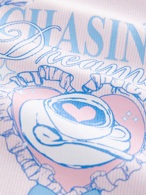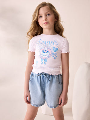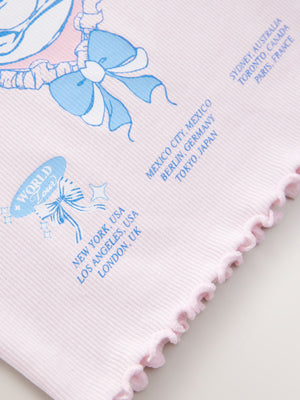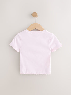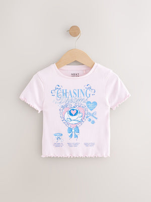 With a pretty vintage look, this cute t-shirt is made from a cotton-blend fabric with a ribbed texture, decorated with a pink and blue graphic print to the chest and a ruffle trim. Cotton-rich Ribbed Chest print Hem detailing Machine washable. 96% Cotton, 4% Elastane. Country of Origin: Turkey