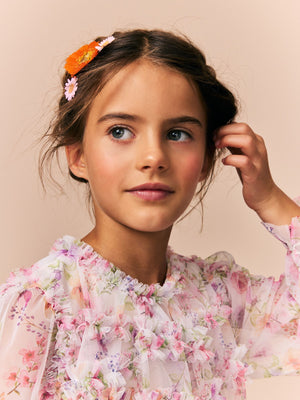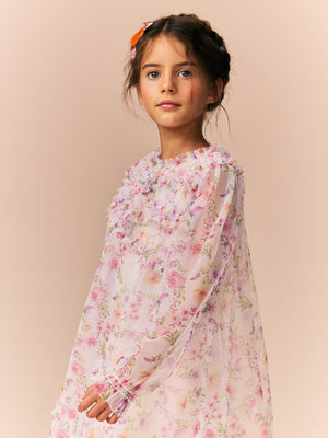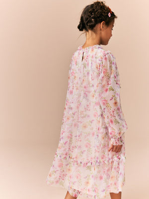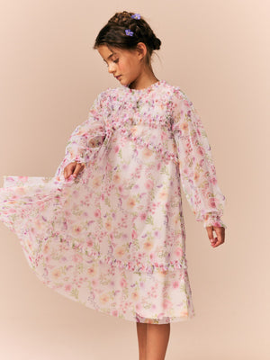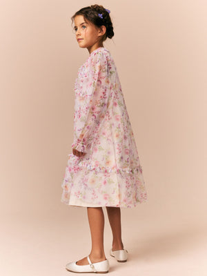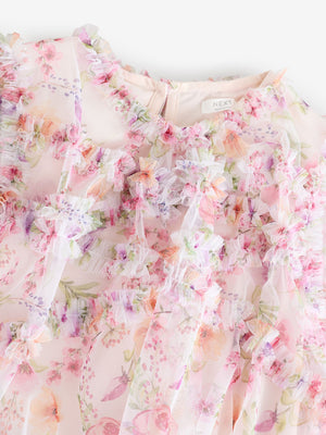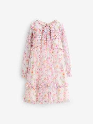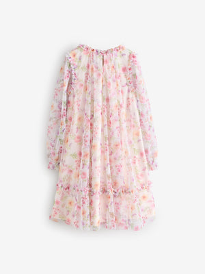 Pink Floral Long Sleeve Mesh Ruffle Occasion Dress (3-16yrs)