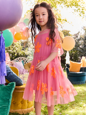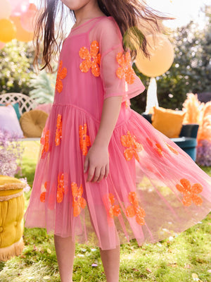 Make sure she sparkles and shines in our enchanting flower mesh party dress. Featuring delicate sequin details, soft tulle fabric with jersey lining and a charming button-back closure. Perfect for special occasions, she'll feel like a princess. Mesh party dress Relaxed fit Soft tulle fabric Sequin detail Button fastening to back Main 100% Nylon. Lining 100% Polyester. Country of Origin: India