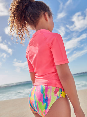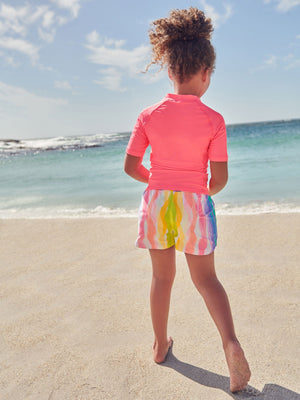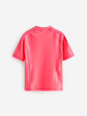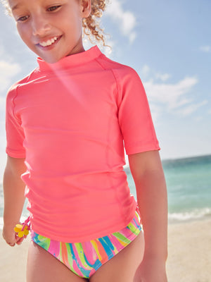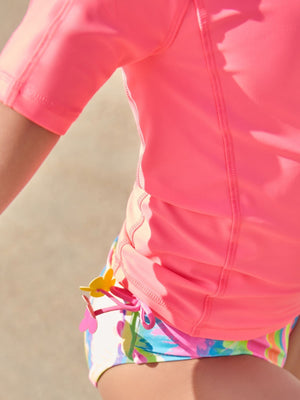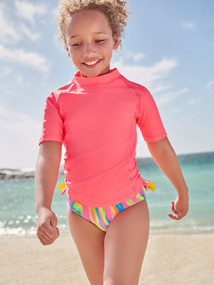 This pink rash vest is perfect for keeping them protected in the sun when it's time for a dip, featuring a high neck and short sleeves, crafted from a soft stretchy fabric with a UPF rating of 50+. Regular fit High neck Stretchy fabric UPF rating of 50+ 82% Recycled polyester, 18% Elastane. Country of Origin: China This fabric will provide protection against solar ultraviolet radiation. It has been independently tested and given a UPF rating of 50+ which blocks more than 97.5% of UV rays. Important Advice: • Sun exposure causes skin damage • Only covered areas are protected • Always use a high protection factor sunscreen on any exposed areas of skin • The protection offered by this fabric may be reduced with use or if stretched or wet • Always rinse in fresh water after each use • Young children should be kept in the shade between 11 and 3 • Don't forget your hat and sunglasses. • Fabric provides UVA +UVB protection from the sun.