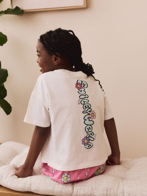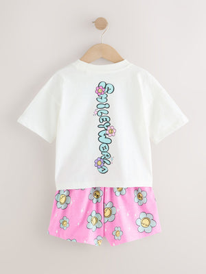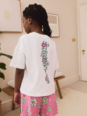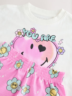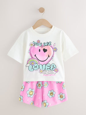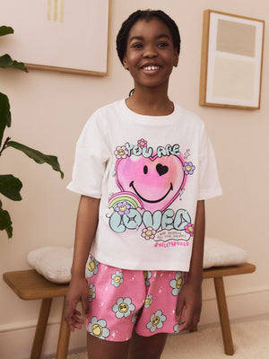 Pink/White 100% Cotton Smiley World Licence Short Pyjamas (3-16yrs)