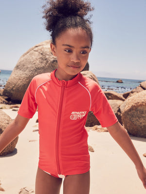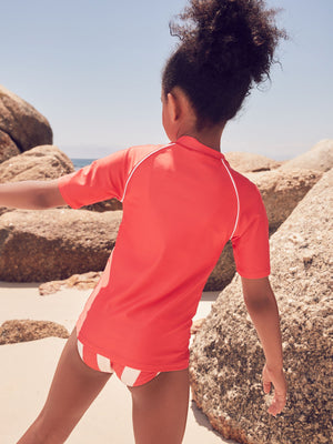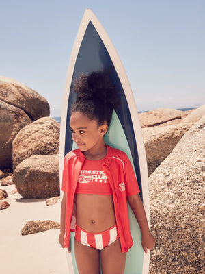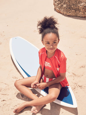 This fun red slogan 3-piece set features a short sleeve rash vest top and a crop bikini with a high collar for great protective coverage from the sun, alongside a pair of matching bottoms with a ruched effect waistband. Finished in a fabric with a UPF rating of 50+, helping to block out 97.5% of UV rays on protected areas. 3 piece set UPF 50+ protection Short sleeve vest Zip fastening Matching bikini set Machine washable. Sunsafe Top and Bikini Top 82% Recycled polyester, 18% Elastane. Bikini Bottom Main 82% Recycled polyester, 18% Elastane. Lining 92% Recycled polyester, 8% Elastane. Country of Origin: China This fabric will provide protection against solar ultraviolet radiation. It has been independently tested and given a UPF rating of 50+ which blocks more than 97.5% of UV rays. Important Advice: • Sun exposure causes skin damage • Only covered areas are protected • Always use a high protection factor sunscreen on any exposed areas of skin • The protection offered by this fabric may be reduced with use or if stretched or wet • Always rinse in fresh water after each use • Young children should be kept in the shade between 11 and 3 • Don't forget your hat and sunglasses. • Fabric provides UVA +UVB protection from the sun.