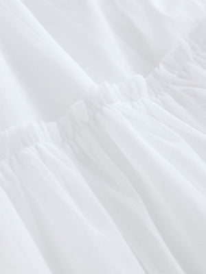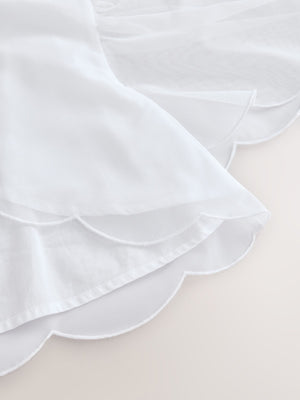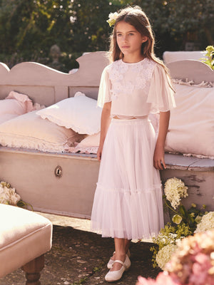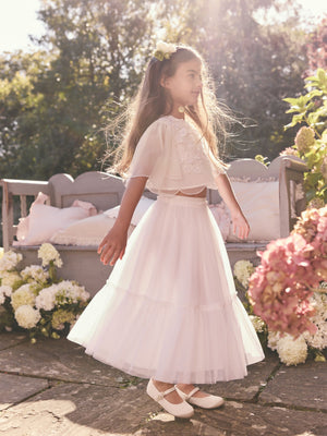 This unique 2-piece set is a modern option for bridesmaids, featuring a boxy top with a layered mesh fabric and 3D floral detailing with sparkling diamantes, short ruffle sleeves and a cotton lining alongside a tiered mesh skirt with an easy pull-on elasticated waistband. 2-piece set Boxy top Layered mesh Cotton lining 3D floral detailing Diamante detailing Tiered mesh skirt Elasticated waistband Machine washable. Blouse Shell 100% Recycled polyester. Lining 100% Cotton. Trim 100% Recycled polyester. Skirt Shell 100% Recycled polyester. Inner 100% Recycled polyester. Lining 100% Cotton. Country of Origin: India