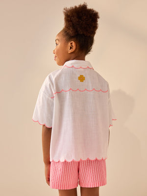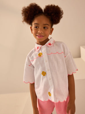This short sleeve shirt is made from pure cotton, cut to a relaxed fit with 3D floral detailing, a button-down fastening, collar detailing and a scalloped edge. 100% cotton 3D floral design Button-down fastening Collar detail Scallop hem 100% Cotton. Country of Origin: India