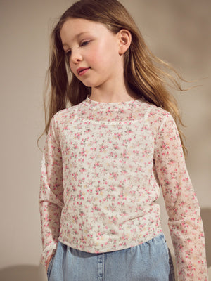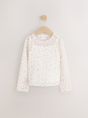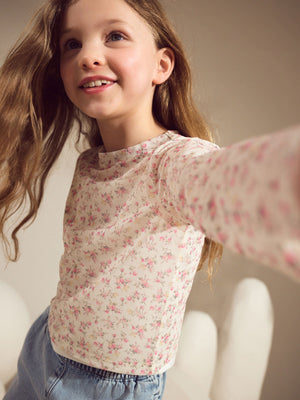Transform her summer looks with our white/pink mesh top. This two piece set includes a vest underlay top and a long sleeve mesh top with a pretty floral print. 2 piece set Long sleeve mesh top Vest top Floral print Machine washable. T-shirt 95% Recycled polyester, 5% Elastane. Vest 100% Recycled polyester. Country of Origin: Turkey